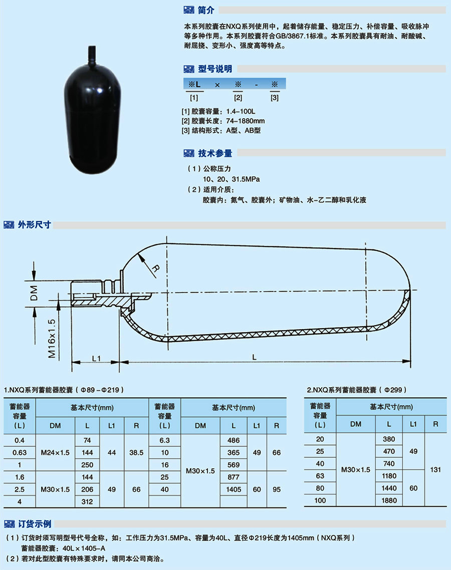1)訂貨時須寫明型號代號全稱。如:工作壓力為(wei)31.5MPa,容量為(wei)40L,長度為(wei)1405mm的(NXQ系(xi)列)蓄能器膠囊:40L×1405-A